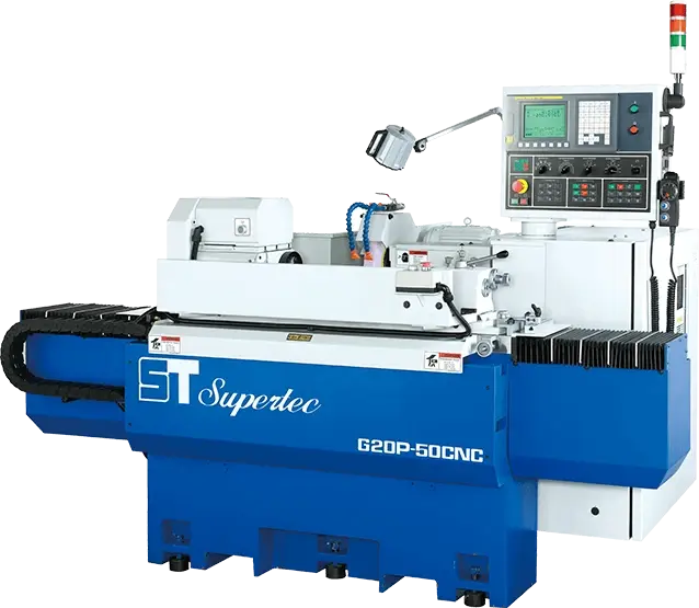 The sturdy rigid-designed workhead equipped with precision bearings is electronically controlled giving variable spindle speeds. Workhead swivels 90°counterclockwise to 30°clockwise for various grinding operations. A combination live and dead-type spindle allows for quick changeover from center to chuck operation or vice versa. A dual oil seal and cover prevent coolant seepage into the workhead.