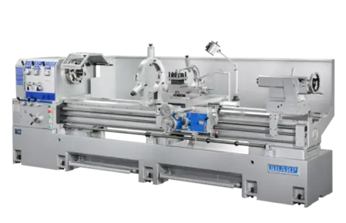 These heavy duty lathes are equipped with D1-11 camlock spindle, 12 speeds (10 - 1,000 rpm), with Chrome-Moly hardened and ground gears in headstock, it has a quick change gear box and direct selection of inch and metric threads, gap bed with hardened and ground bed ways. The models are built on one piece casting bases for rigidity. Machine come standard with 4 jaw chuck, face plate, steady rest, coolant system, splash guard, chuck guard, rapid traverse carriage on models longer than 100" centers. Optional double chuck is available.