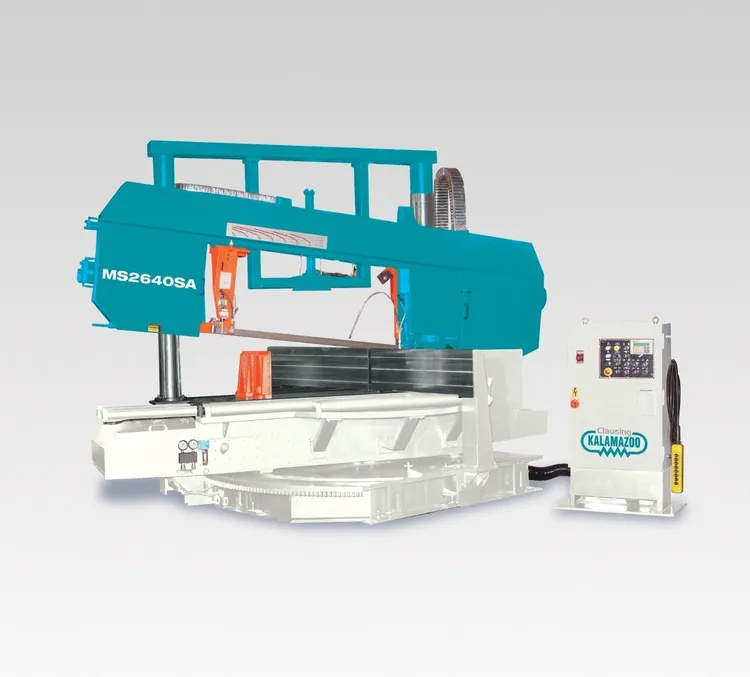 Clausing Kalamazoo Semi-Automatic Horizontal Miter Bandsaw, Twin Column Head Support, 20.5” x 40” Max Rectangular Capacity, 26” Round Capacity, Variable Inverter Drive, SFPM 49 to 295 Blade Speed, 10 Hp drive motor, 230 or 460 Volts 3 Phase