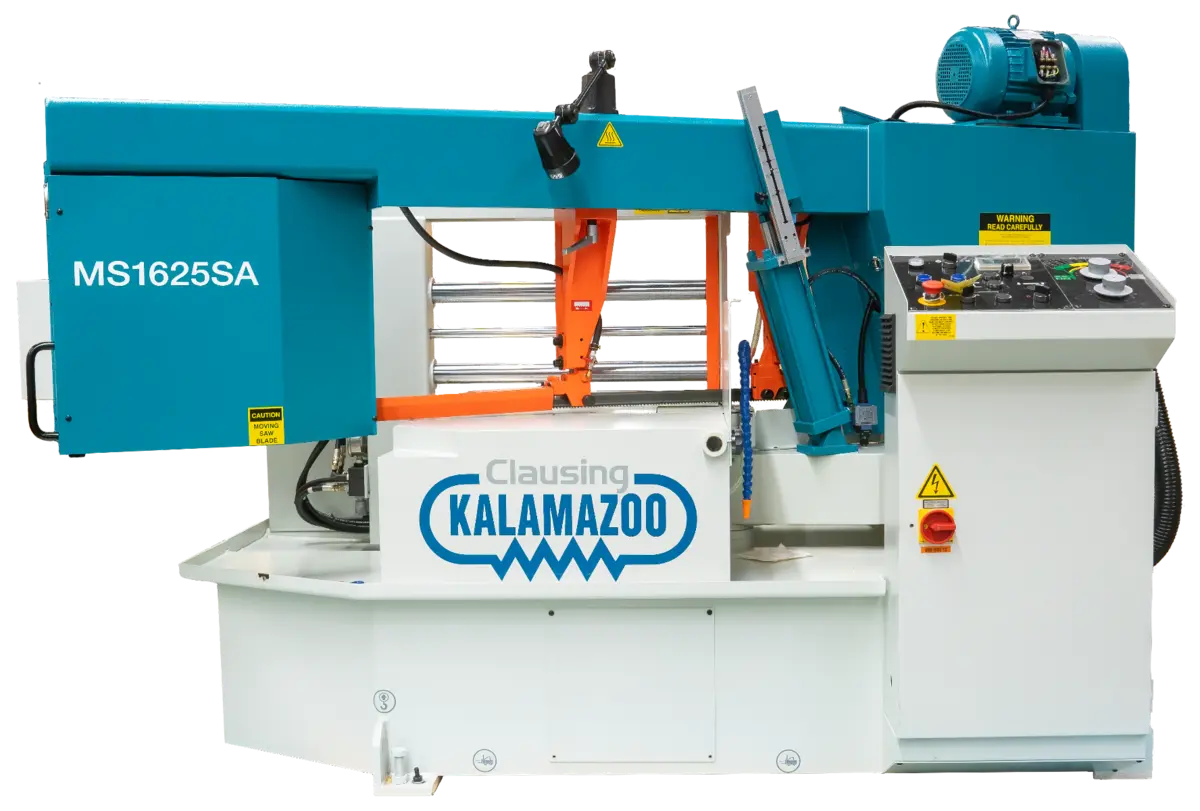 Clausing Kalamazoo Semi-Automatic Horizontal Miter Bandsaw, Twin Column Head Support, 15” x 26.6” Max Rectangular Capacity, 16” Round Capacity, Variable Inverter Drive, SFPM 66 to 328 Blade Speed, 5 Hp drive motor, 230 or 460 Volts 3 Phase